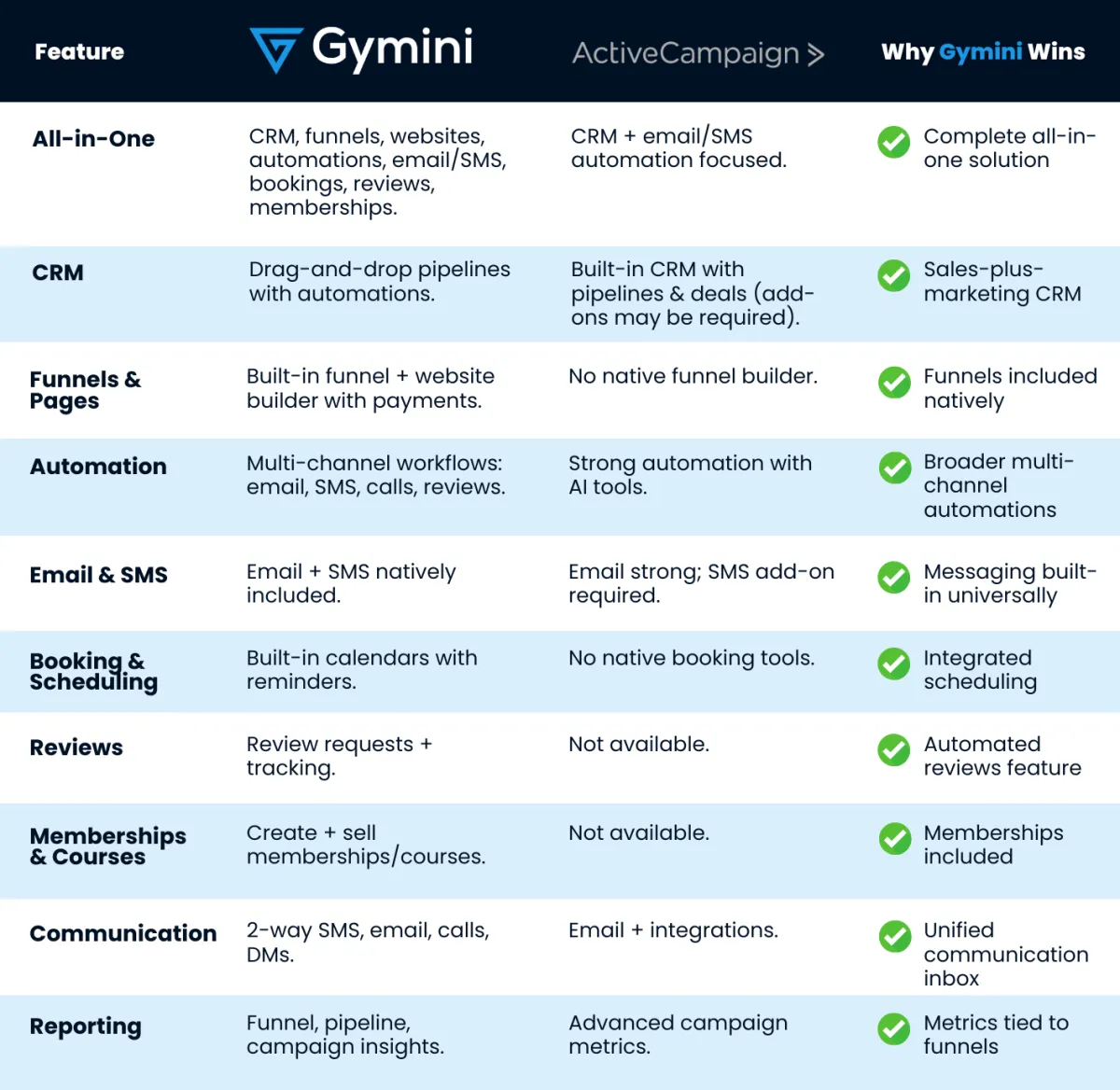 Looking for a CRM that fits your gym, studio, or coaching business? ActiveCampaign is a popular platform for email marketing and automation, but it isn’t built specifically for gyms. GYMINI, on the other hand, was designed for fitness businesses, giving you all the tools you need in one platform that works right out of the box.