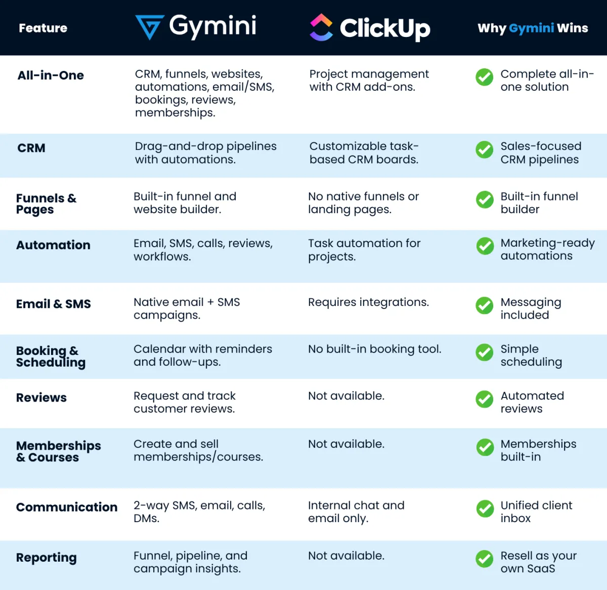 With ClickUp, you may end up piecing together third-party tools for bookings, payments, and client communication. This creates a patchwork system that is harder to manage and more prone to errors. GYMINI is different. Everything is built in. You get a complete platform that handles lead generation, bookings, automations, payments, and follow-ups in one place.