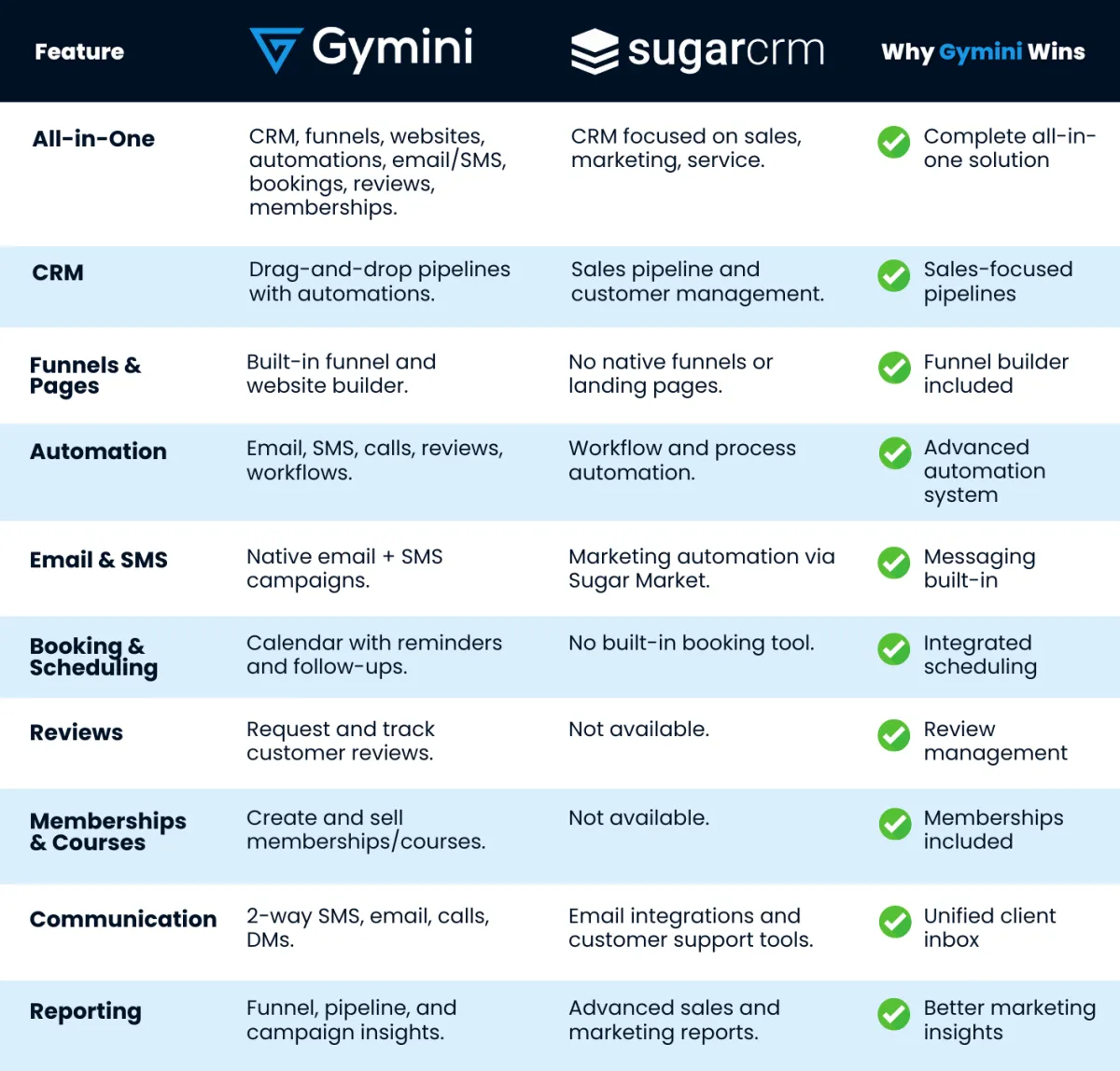 With SugarCRM, you may find yourself adding third-party tools for bookings, payments, and client communication. This creates a fragmented system that is harder to manage and more expensive in the long run. GYMINI is different. Everything is built in. You get a complete platform that handles lead generation, bookings, automations, payments, and follow-ups in one place.